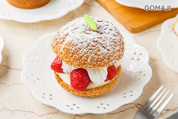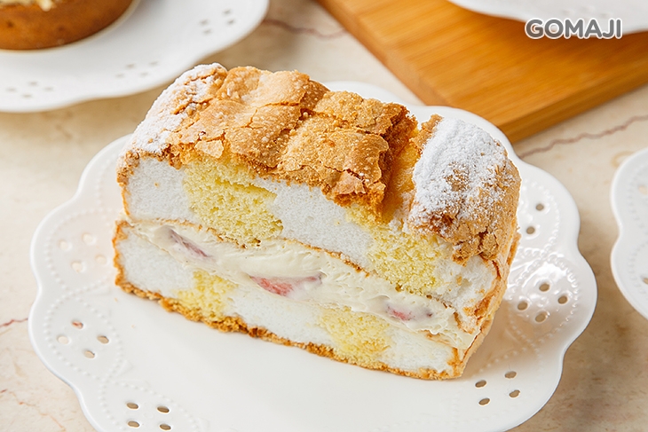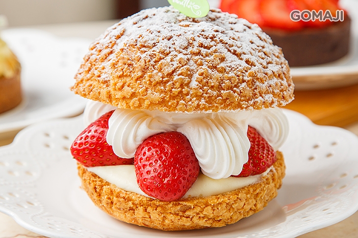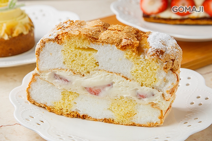 看看這切面,妳的心是否都要融化了呢?特殊鬆軟蛋白、蛋黃糕夾層設計,交織出層次豐富的口感,一白一黃吃起來好綿密,表皮微微酥脆,將卡士達奶油、新鮮草莓緊緊包裹,甜度適中,一人吃一塊絕對不夠!