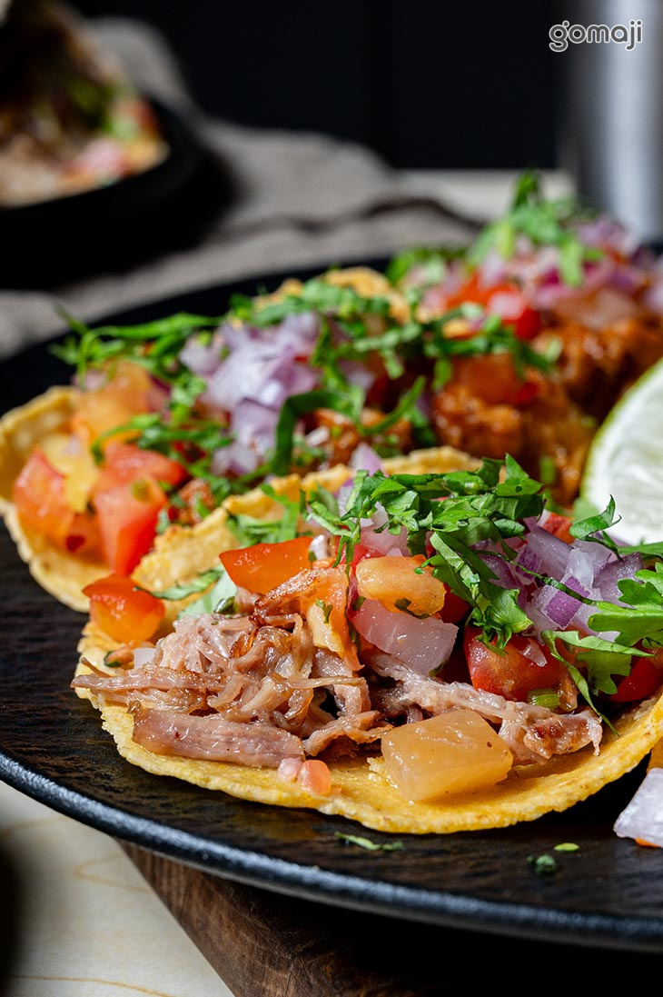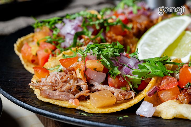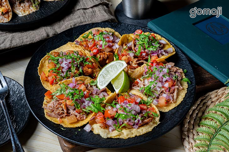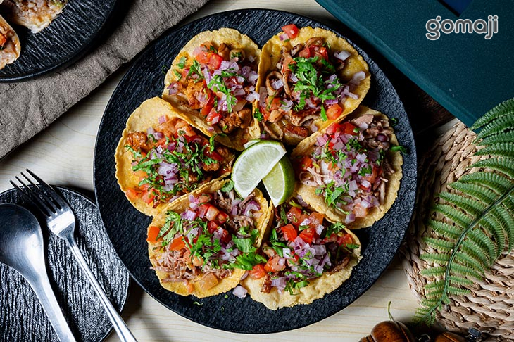 肉肉塔可派對組以多樣肉類為主角,搭配鮮豔的洋蔥丁、香菜和蕃茄碎,色香味俱全。每片塔可餅皮烘得鬆脆,承載著充滿肉汁的絞肉,咀嚼時有滿滿的多汁口感。肉香中夾帶著香料的微辣味,並伴隨些許檸檬的酸勁,提亮整道料理的風味。這款派對組的搭配讓人吃得盡興,是多人分享時不可或缺的歡聚料理。
