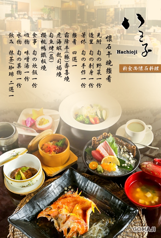 首創懷石料理風格,將藝術與美食完美的結合,並使用頂級建材,名家藝術創作,昂貴石材及藝術家手工陶器等,精緻的美味佳餚藝術及特殊手工陶盤的襯托下,更添樸實質感及高品味豪華風,在現代與文化的撞擊下,迸出八王子無可取代的餐飲風格。