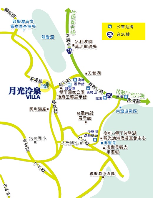 位在龍巒潭附近,地理位置接近關山、後壁湖等景點,往墾丁大街也只需10分鐘,交通便捷卻又像世外桃源一樣,避開喧鬧的人潮,獨立處在墾丁南灣、白砂灣兩大戲水樂園的中間地帶,是格外寧靜自然。泡一下獨特的冷泉,沁涼的滋味讓您全身毛孔都舒暢了起來,在自然原野中,白天看遍田園美景,晚上曬一下月光聆聽天籟,一種有別於其他旅店的風情,只專屬於懂得放鬆心情來度假的旅人們。