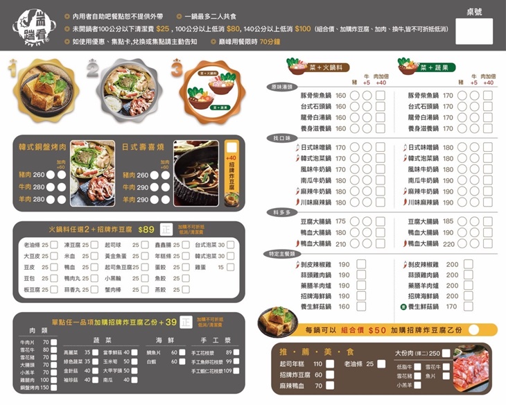 店家提供平價高CP值,多樣化口味的鍋物品項,搭配多種精心挑選的新鮮食材,嚴格控管餐點品質,堅持讓顧客用最平價的價錢,享受到最高品質的火鍋。每一鍋都能感受到店家的誠意與用心,料多實在、湯濃味美,每樣湯頭都有其特色風味,品嚐過的客人皆讚不絕口,且內用可無限享用豐盛的自助吧,期盼給予味蕾無限的驚喜與滿足~絕對是您下班、課後,聚餐約會、享受美食的最佳選擇!