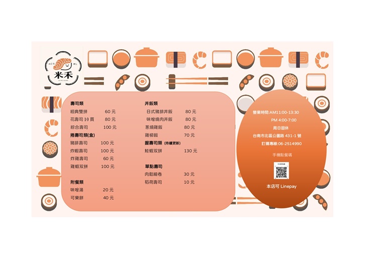 米禾壽司是一家專門提供壽司料理的店,以新鮮食材、親民價格吸引了許多忠實顧客。店內環境乾淨簡約,走的是溫馨小店風格,適合外帶或簡單內用。這裡的壽司採用每日新鮮採購的食材製作,能感受到食材的鮮甜與細緻口感。米飯的捏製比例恰到好處,不會過於鬆散或黏稠,讓整體口感更加順口,適合當成簡單的一餐。