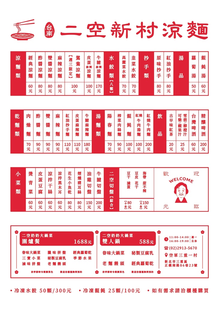 二空奶奶眷村好味道,以懷舊風格成為老饕與吃貨的經典選擇。這裡的涼麵堅持傳統職人手作,麵條 Q 彈爽滑,搭配特製芝麻醬,香濃而不膩。醬汁鹹甜比例恰到好處,再鋪上清脆的黃瓜絲與鮮嫩豆芽,為整體口感增添了層次與清新感。不僅如此,店內還提供多款熱麵、水餃、抄手、火鍋、懷舊梅花餐等其他選擇,無論是經典麵食、特色小菜或桌菜家宴,都能滿足您對美味的期待。