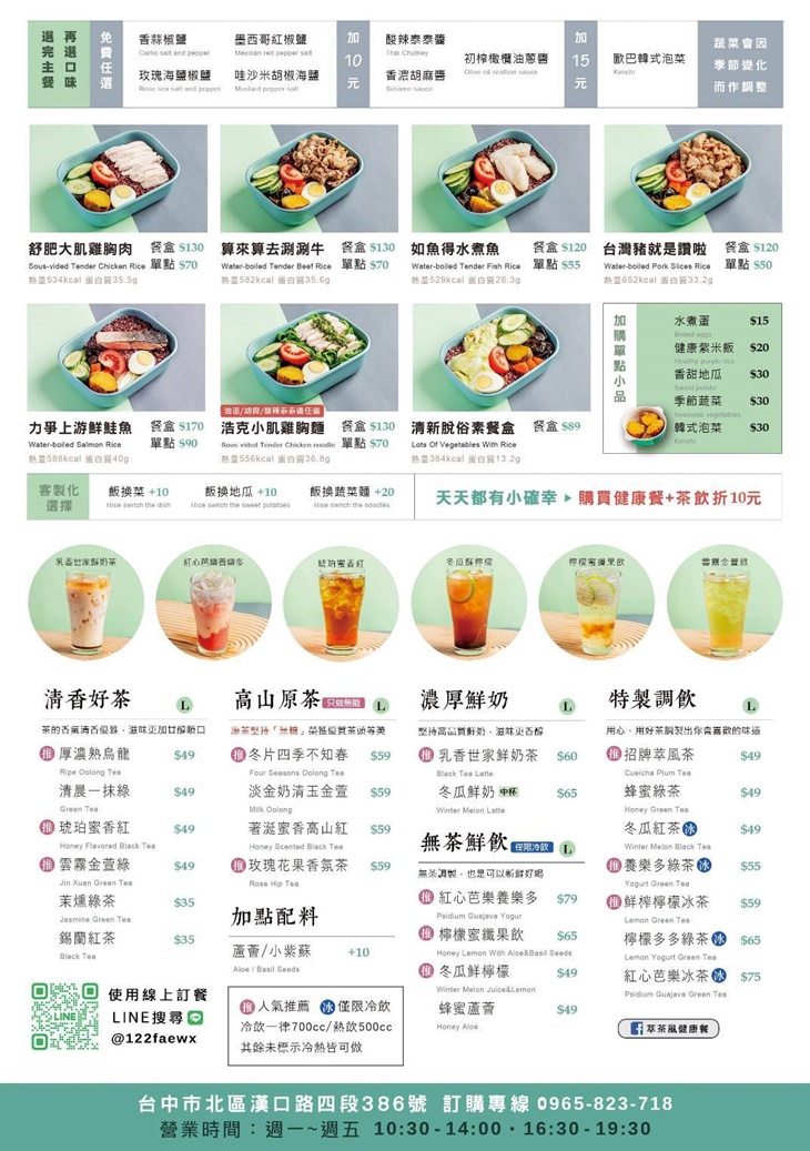 一家主打健康與自然飲食的餐廳,結合輕食概念與茶飲文化,提供高品質的健康餐點選擇。店內餐點採用低油、低鹽、低糖的烹調方式,搭配新鮮蔬菜與精選食材,滿足現代人對健康飲食的需求。菜單上有多樣化的健康餐盒選擇,例如鮮嫩的水煮魚、涮涮牛肉及台灣豬肉,搭配紫米飯,再加入多樣化的時蔬,營養均衡又美味,適合忙碌的上班族和注重健康的家庭客群。