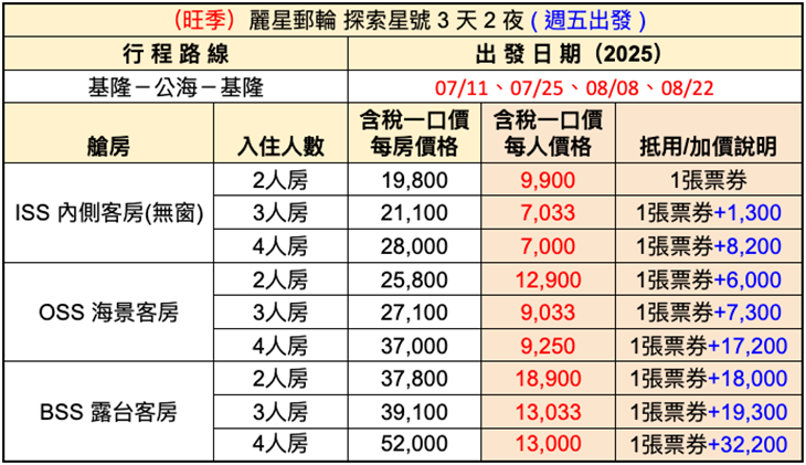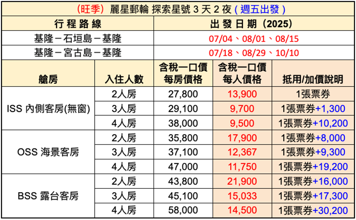 【麗星郵輪探索星號】3天2夜,週三/週五基隆港出發,雙人同行專案