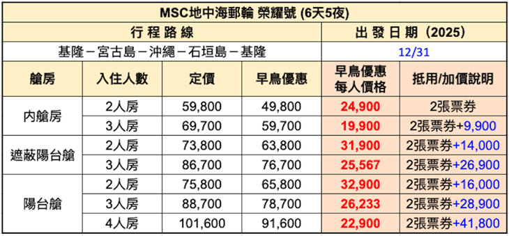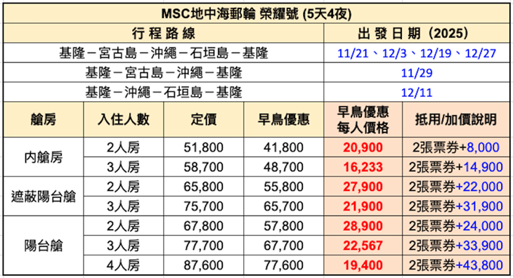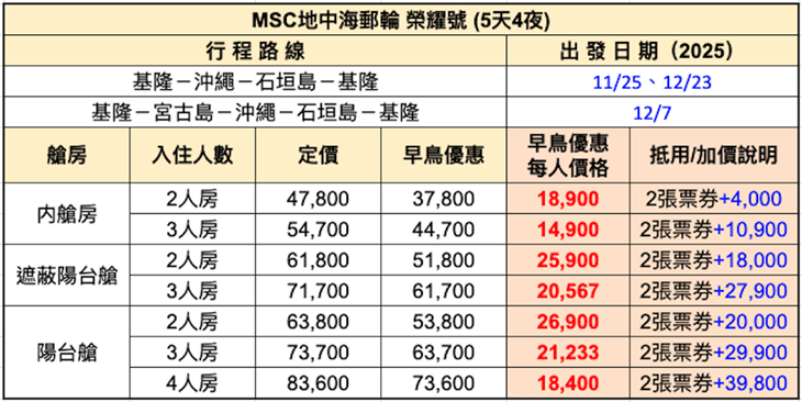 【MSC地中海郵輪榮耀號】早鳥優惠只到06/30!5天4夜/6天5夜,入住內艙房,單人券(雙人同行),可加價升等艙房