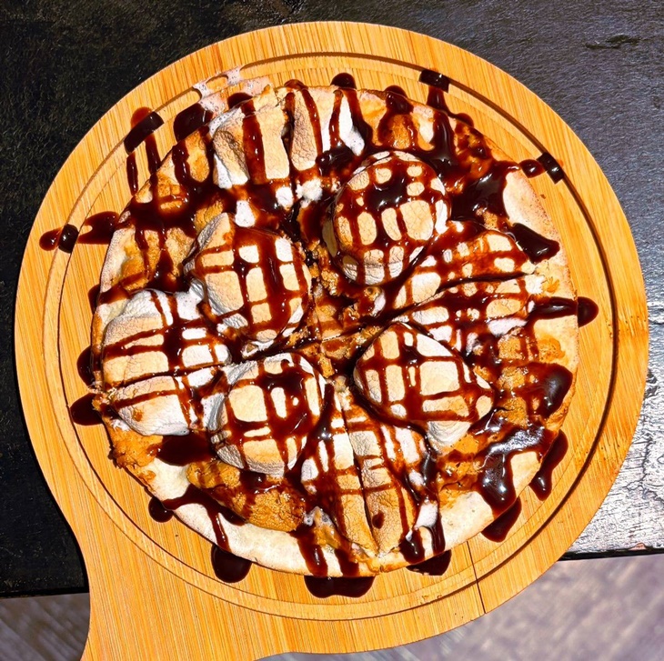 花生棉花糖巧克力 pizza 是一款充滿驚喜感的甜點型披薩,將甜與香完美融合在一起。餅皮烘烤後帶著柔韌口感,搭配濃郁可可風味,入口時甜香立刻在嘴裡展開。棉花糖融化後帶來柔軟滑順的層次感,讓整體吃起來更加圓潤,甜而不膩。每一口都能感受到香氣與口感的交錯變化,越吃越有趣。不論是當作餐後甜點或與朋友分享,這款披薩都能為用餐畫下令人滿意的句點,是讓人一試就印象深刻的特色選擇。