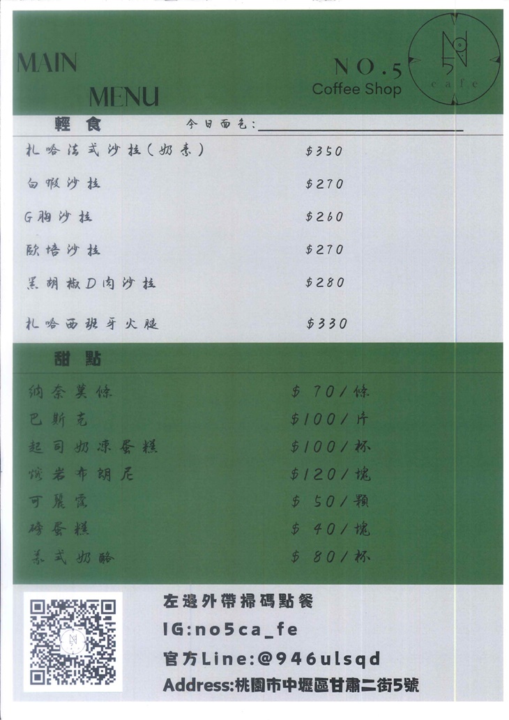 NO.5 CAFE 是一間充滿生活感的輕食咖啡館,店內氛圍溫馨自在,結合質感裝潢與綠意元素,讓人一走進來就感受到放鬆。菜單主打沙拉、甜點及多款咖啡與飲品選擇,從豐富的拼盤到細緻的甜品都展現出用心與巧思。不論是想悠閒吃頓早午餐、下午來份甜點配拿鐵,或是找個角落工作發呆,這裡都是很不錯的選擇。適合三五好友聚餐,也適合獨自一人享受靜謐時光。