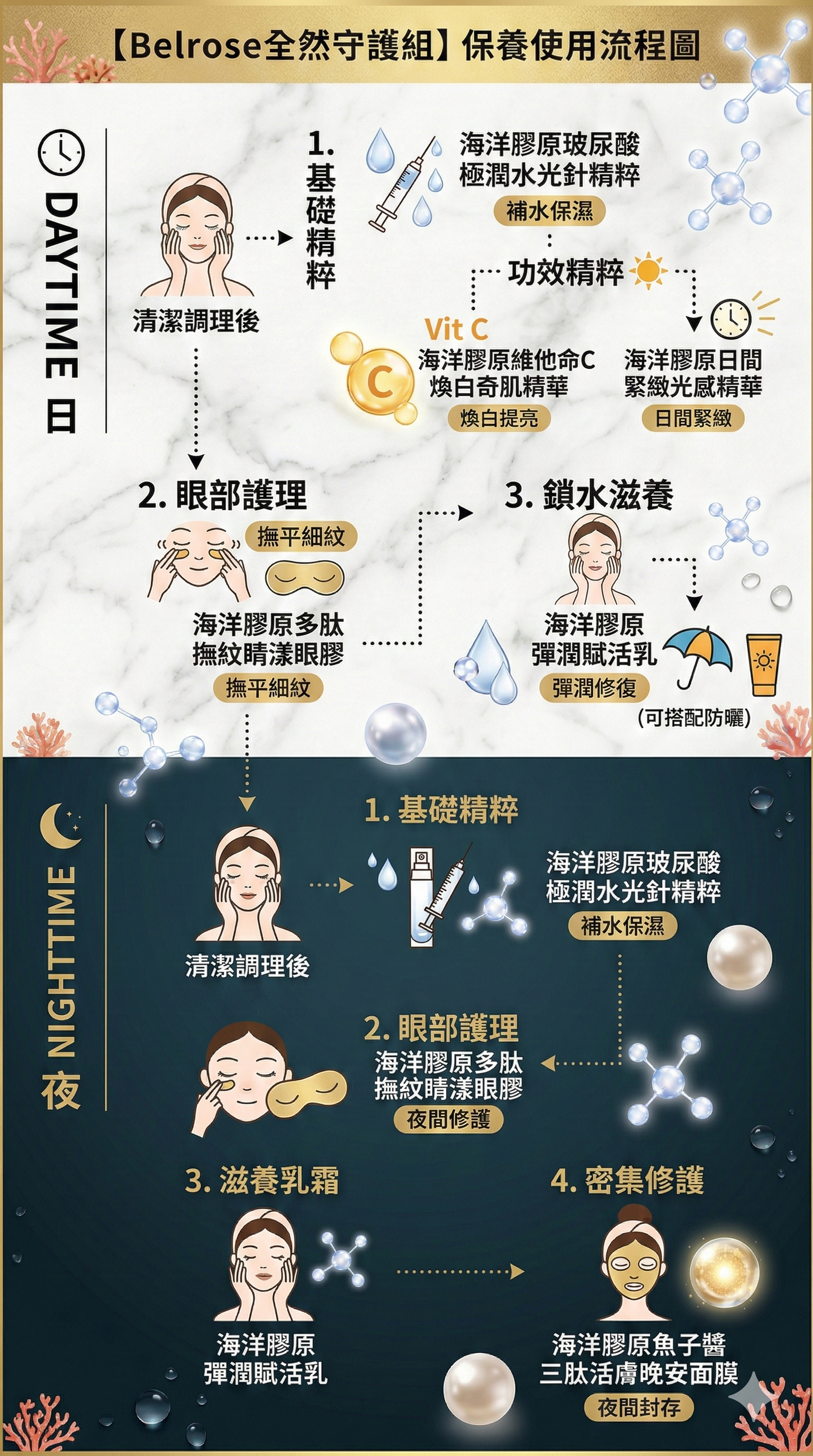 C.【Belrose】日安光澤組-海洋膠原玻尿酸極潤水光針精粹1入 + 海洋膠原維他命C煥白奇肌精華1入,加贈海洋膠原多肽撫紋睛漾眼膠1入