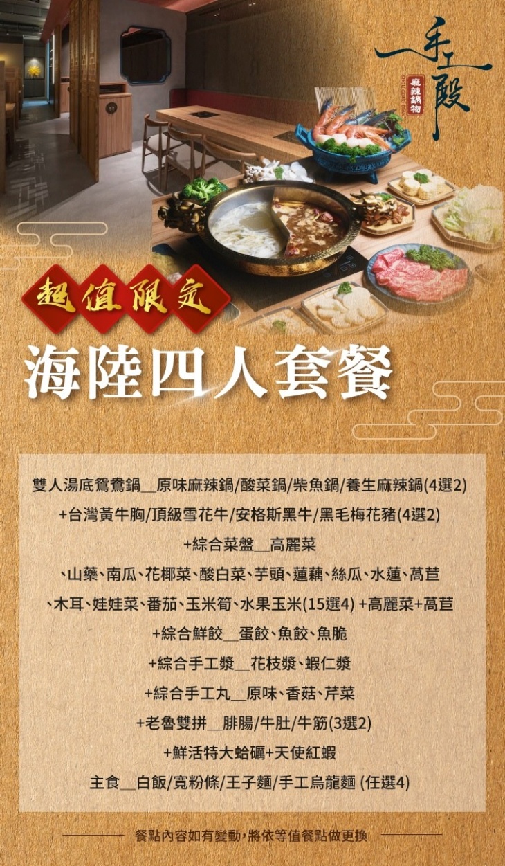 只要1880元起,即可享有【台北手工殿麻辣鍋物】超值限定海陸雙人/四人套餐券