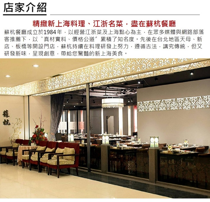 只要1799元起,即可享有【台北蘇杭餐廳】雙人/四人套餐券(四家分店通用)