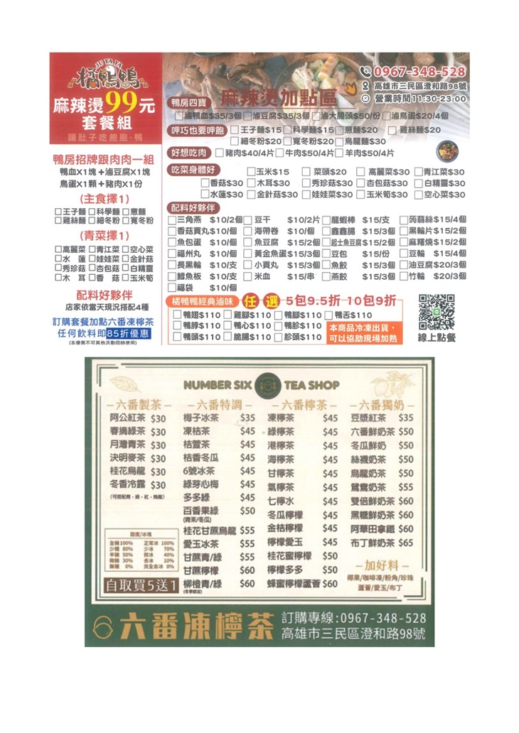 橘鴨鴨x六番製茶 是一家結合滷味與手搖飲的特色小店,主打台式鴨香滷味與茶飲的創意搭配,將「重口味」與「清爽系」完美平衡。滷味部分以鴨系列為主角,像是招牌鴨翅、鴨血、鴨頭等,每款都入味香濃、口感紮實,滷汁香料味濃卻不搶戲,吃起來非常過癮。飲品方面則由「六番製茶」提供,主打現萃茶底與自製布丁奶茶、清香果茶等,喝起來解膩又有層次。整體風格帶點文青感但不失台味,無論是想吃點小東西配飲料,或是當正餐享用,都非常適合。