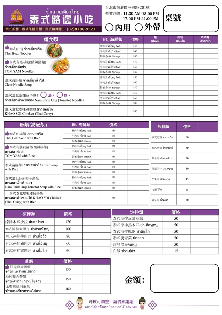 泰福泰式路邊小吃是一家主打道地泰國風味的平價小店,主廚來自泰國,料理風格保留當地路邊攤的樸實做法與濃厚香氣。餐點選擇多元,從招牌綠咖哩雞、酸辣冬蔭功湯、泰式炒河粉,到特製船麵、打拋豬飯等,每一道都吃得到香料的靈魂與層次豐富的口感。店內氛圍輕鬆親切,裝潢簡單卻充滿熱帶感,是那種讓人走進來就像真的到泰國街頭用餐的感覺。份量剛好、價格實在,不論是想吃點辣香開胃的主食,還是來碗熱呼呼的湯麵,都能滿足。適合一個人簡單吃,也很適合三五好友小聚,喜歡泰式小吃的你絕對會愛上這家有味道的小店。