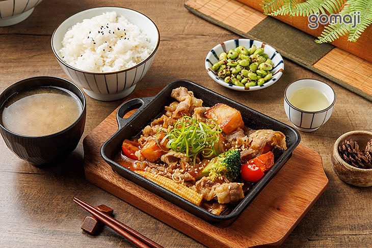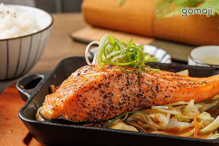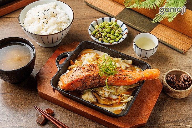 秋鮭鏘鏘燒端上桌時,嗞嗞作響的鐵板聲超迷人。厚實鮭魚排表面微焦金黃,灑上香料,油脂在高溫中緩緩滲出,散發濃郁卻不膩口的海味香氣。魚肉切開是柔嫩橘粉色,細緻多汁、入口即化,完全感受得到鮭魚飽滿油脂與鮮甜。底層鋪滿多樣時蔬,吸附醬汁後鹹甜滑口,讓整體風味更加飽滿立體。搭配香Q白飯與溫熱味噌湯,就是一份色香味俱全、既滿足又療癒的日式鐵板套餐。