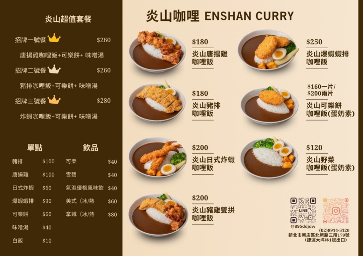以平實價格與濃厚風味擄獲饕客味蕾的咖哩專門店,鄰近捷運大坪林站,交通便利、用餐方便。紅黃招牌搭配火山LOGO設計,醒目又具個性,讓人路過都忍不住多看幾眼。店內裝潢簡約清爽,營造出舒適自在的用餐氛圍。主打多款咖哩定食,從酥脆豬排、炸雞、炸蝦到可樂餅,選擇豐富、料多實在,不少饕客一試成主顧。咖哩醬每日現煮,精心熬煮的香料與蔬果完美融合,醬體濃郁順口、不膩不重,令人一吃上癮,大人小孩都超愛,是在地人私藏的人氣口袋名單。看似簡單的一碗咖哩飯,卻藏著店家滿滿的用心與誠意,樸實卻不平凡。.jpg)