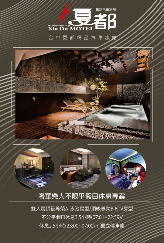 超脫一般汽車旅館制式的設計,擁有天光水景、寧靜優雅、奢華出眾的品味設計!浪漫歐洲、日式禪風、中國古典等風格,讓您置身於最華麗的浪漫氛圍!遼闊、舒適的視野,迷情境地─夏都與您相約,延展生活無限情意!