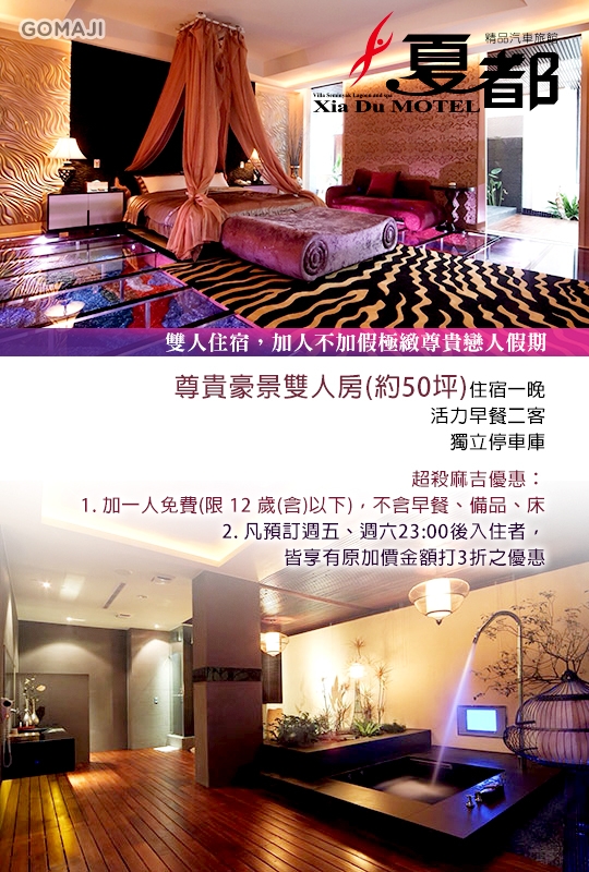 超脫一般汽車旅館制式的設計,擁有天光水景、寧靜優雅、奢華出眾的品味設計!浪漫歐洲、日式禪風、中國古典等風格,讓您置身於最華麗的浪漫氛圍!遼闊、舒適的視野,迷情境地─夏都與您相約,延展生活無限情意!
