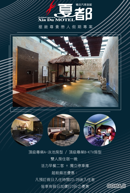 超脫一般汽車旅館制式的設計,擁有天光水景、寧靜優雅、奢華出眾的品味設計!浪漫歐洲、日式禪風、中國古典等風格,讓您置身於最華麗的浪漫氛圍!遼闊、舒適的視野,迷情境地─夏都與您相約,延展生活無限情意!