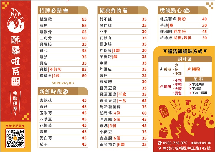 一家主打鹽酥雞的炸物專賣店,風格輕鬆、味道實在,深受附近學生和上班族喜愛。餐點現點現炸,香氣四溢,每一口都吃得到酥脆與熱騰騰的爽感。不只有招牌鹽酥雞,還有甜不辣、米血、銀絲卷、魷魚等經典炸物可以自由搭配。口味上調味不會過重,外酥內嫩,鹹香中帶點胡椒香或辣粉香氣,越吃越涮嘴,是那種讓人一試成主顧的深夜好味道。