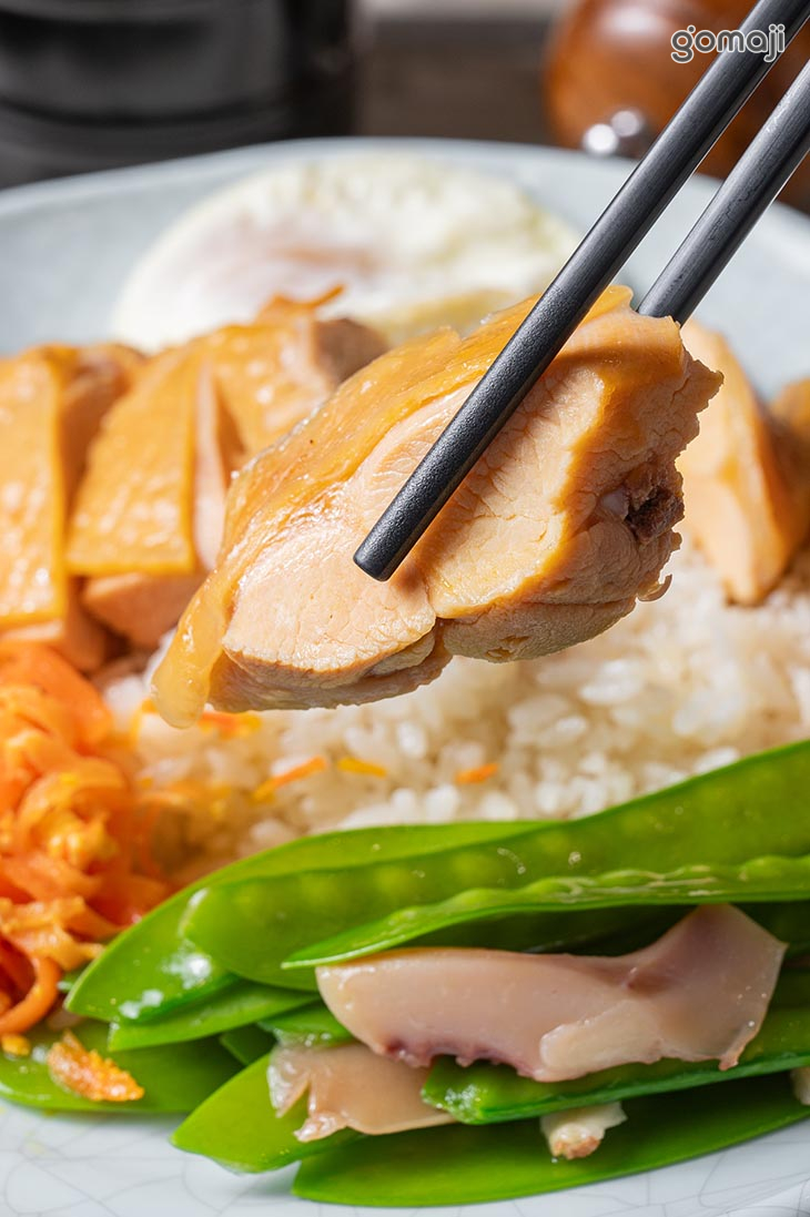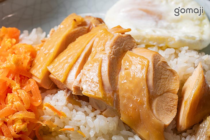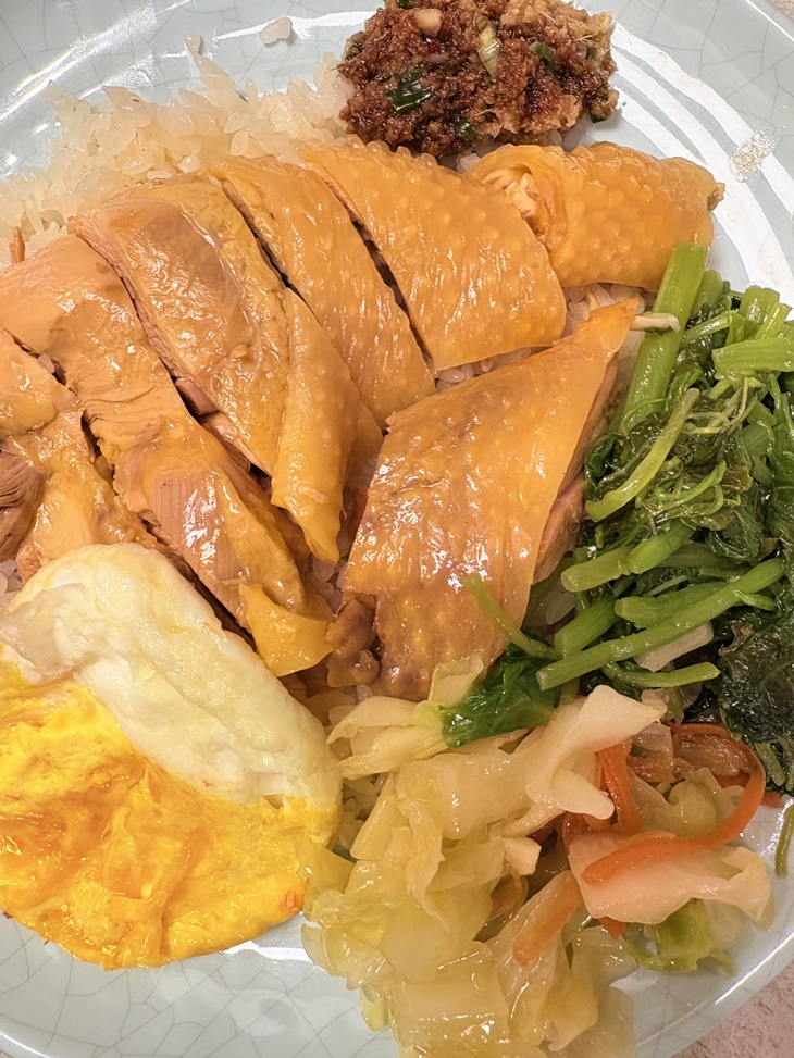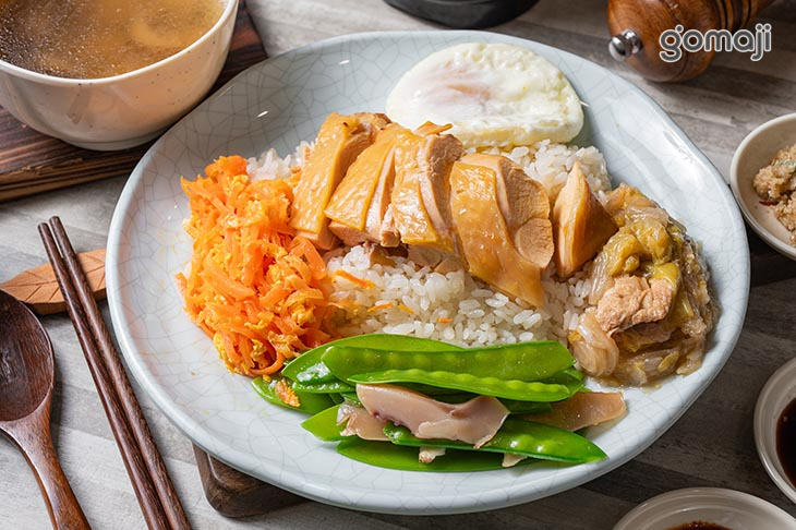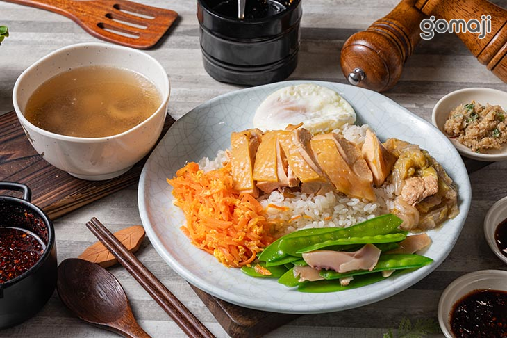 招牌海南雞飯一份(含三樣小菜+荷包蛋一顆) (使用珍珠玉米雞)