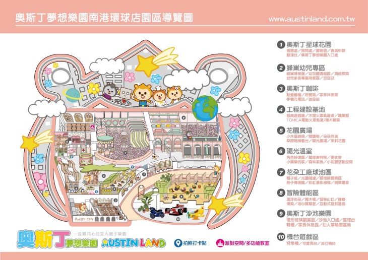 奧斯丁夢想樂園-南港環球店 ♕ 台北親子出遊新熱點,孩子的夢想冒險樂園! 由奧斯丁夢想樂園團隊傾心打造的【南港環球店】融合城市冒險元素與童趣幻想設計,打造全新世代的親子互動天地。園內規劃多樣主題區域,包含冒險體能區、花朵工廠球池區、蜂巢幼兒區及奧斯丁星球花園,讓不同年齡層的孩子都能找到屬於自己的夢想舞台。 奧斯丁夢想樂園—在這裡,夢想不只是想像,而是孩子每天都能親身體驗的快樂冒險!