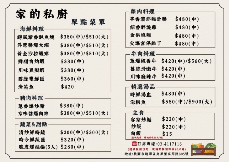 隱身在綠意盎然的庭園之中,家的私廚不僅是一間餐廳,更是一處找回情感與回憶的心靈食堂。由兩位主廚聯手坐鎮,透過各自的人生故事與深厚廚藝,共同譜出一道道充滿溫度與靈魂的料理。承襲農家子弟的樸實精神,用私廚手法呈現家的味道,讓每道經典手路菜鹹香濃郁、層次豐富,令人一試難忘。餐廳空間寬敞明亮,備有圓桌與宴會廳,無論是家庭聚餐、朋友聚會還是喜慶宴客,都能享有賓至如歸的款待。家的私廚,用一桌好菜,來款待每一位,讓你不只吃得飽,更吃得暖心。