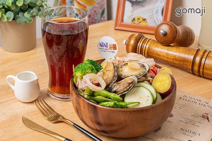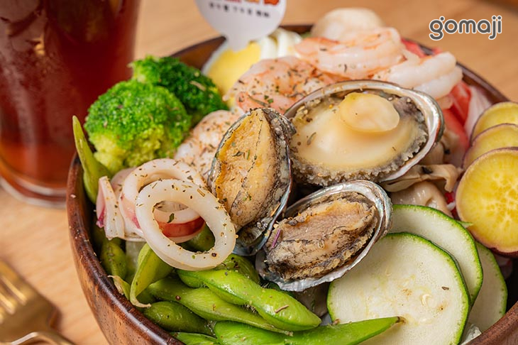 以豐富食材與均衡營養為主軸,呈現視覺與味覺的雙重享受。主角鮑魚肉質Q彈鮮甜,搭配彈牙的花枝,海味層次分明,每一口都充滿大海的鮮美氣息。新鮮蔬菜如青花椰、櫛瓜與脆口豆莢,帶來清爽口感與自然甜味,平衡海鮮的濃郁。特別加入綿密香甜的地瓜,為整體增添溫潤口感與淡淡甜香,整體口感清新卻不單調,營養豐富又低負擔。來上一碗這樣精緻又清爽的豪華海鮮沙拉,不僅滿足味蕾,也讓身心感到輕盈愉悅。
