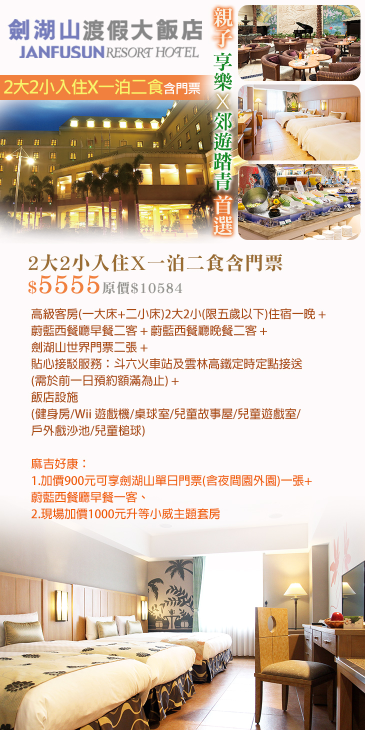 ★ 免費附贈劍湖山世界門票二張,讓您住得開心、更玩得盡興!