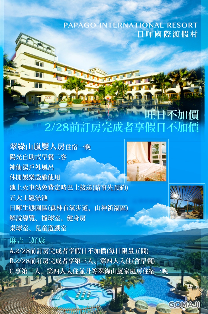 【台東-日暉國際渡假村】感謝麻吉們熱烈搶購,已全數賣光光。