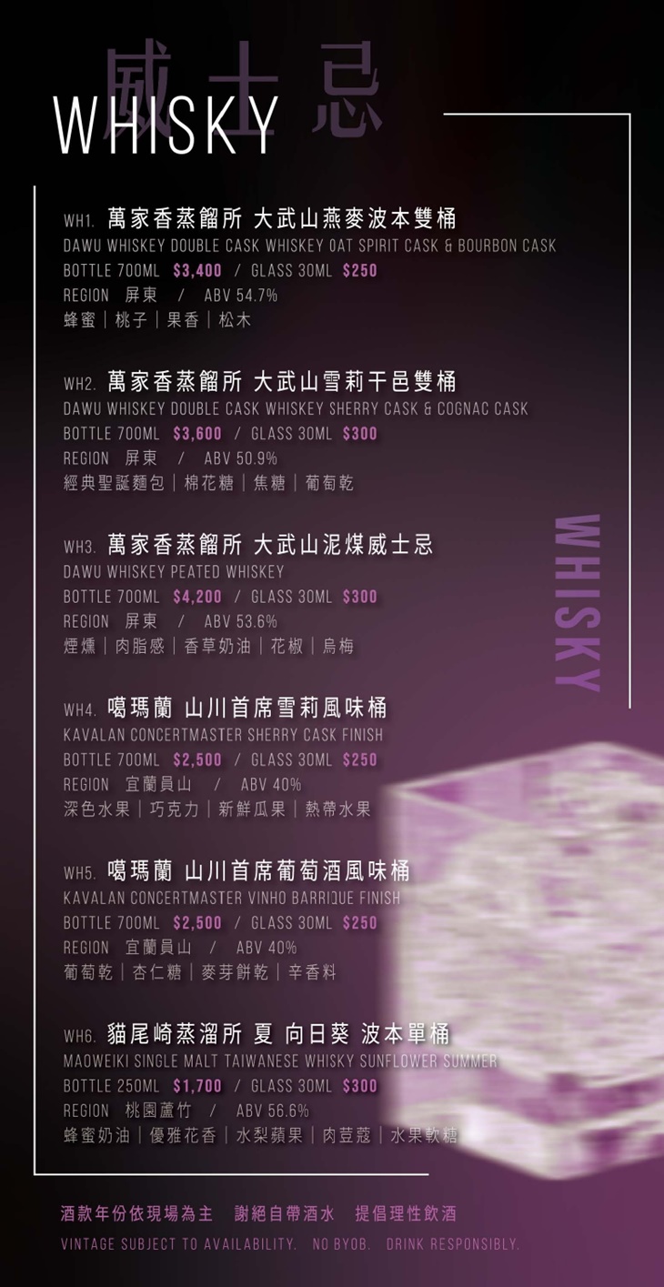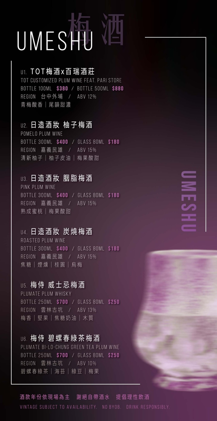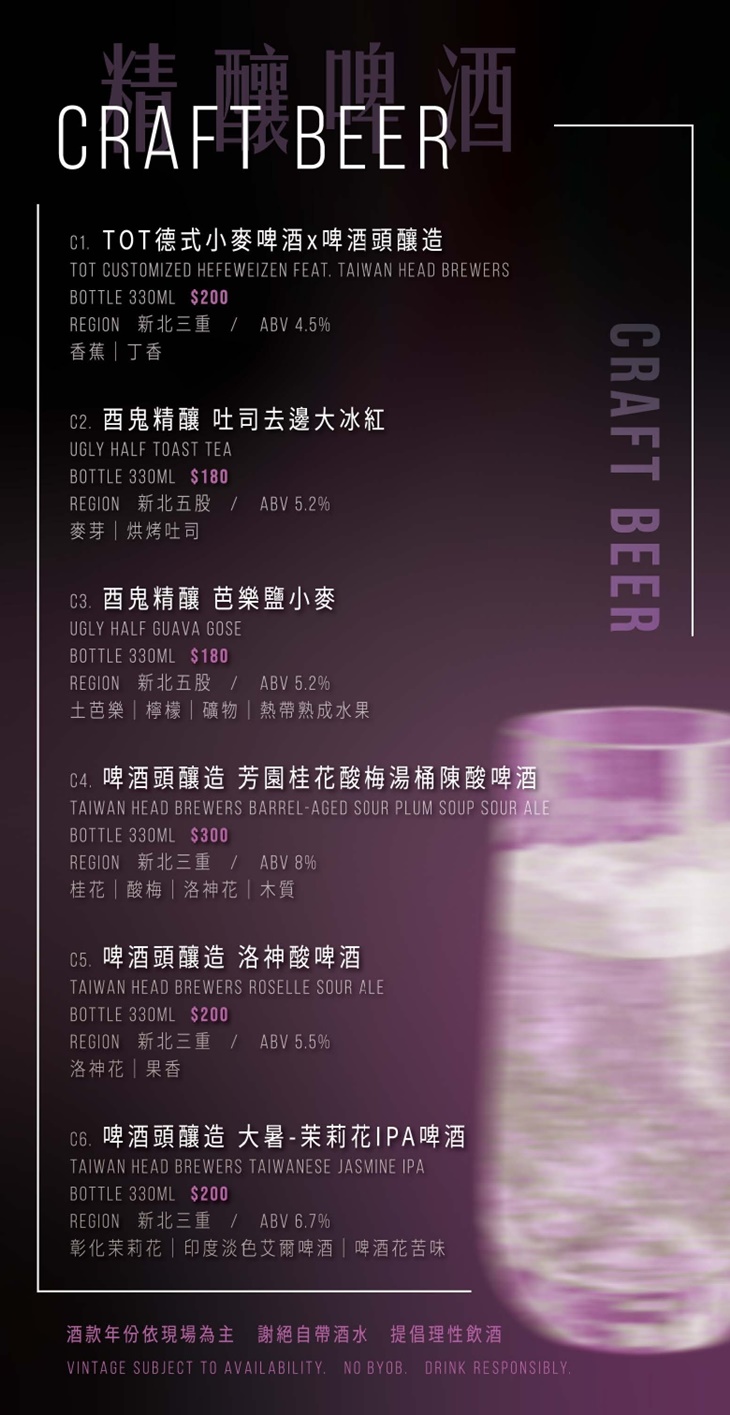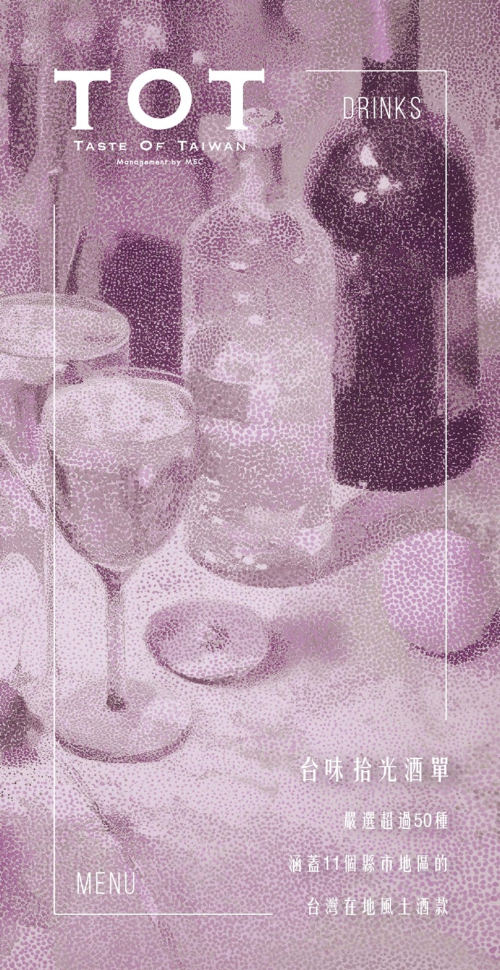 TOT 精選了超過 50+款 台灣在地精釀與精餾酒品,酒單豐富又多元,從水果氣泡酒、梅酒 清酒、小米酒、蘭姆酒、葡萄酒到威士忌,皆產自台灣本土。