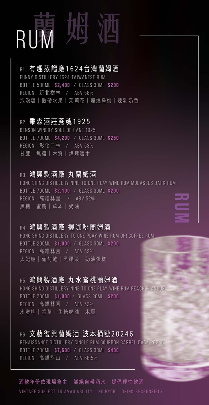-文藝復興蘭姆酒:品牌致力於推廣台灣風土的蘭姆酒文化,更提供限量裝瓶的最新批次蘭姆酒,讓消費者品嚐最即時的寶島精餾風味。