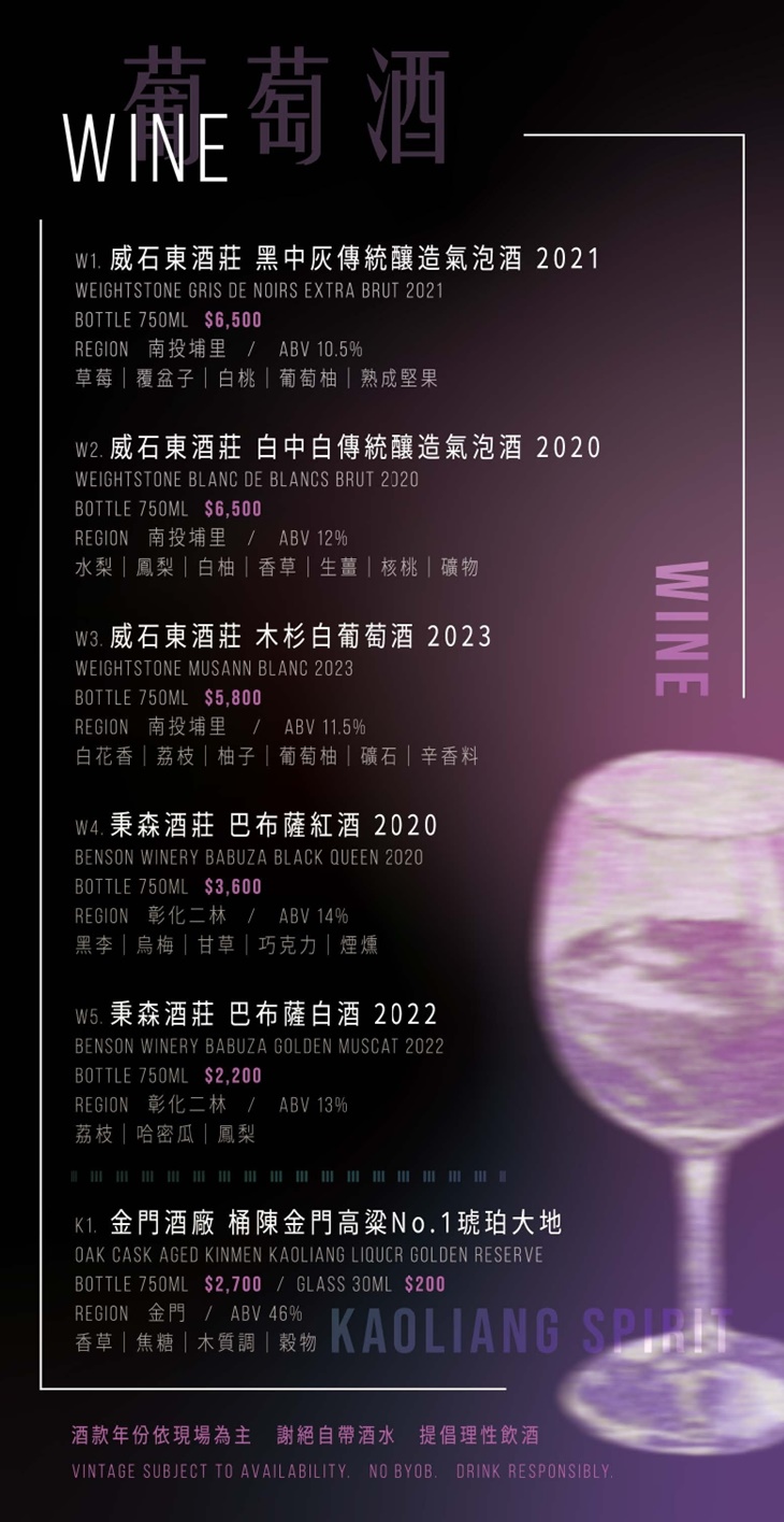 ★台灣葡萄酒代表: 威石東台灣葡萄酒酒莊(榮獲超過 50 個國際葡萄酒獎項)、百瑞酒莊(從米廠女兒到酒莊創辦人的在地風味)、秉森酒莊(專注於台灣在地水果酒及葡萄酒)。