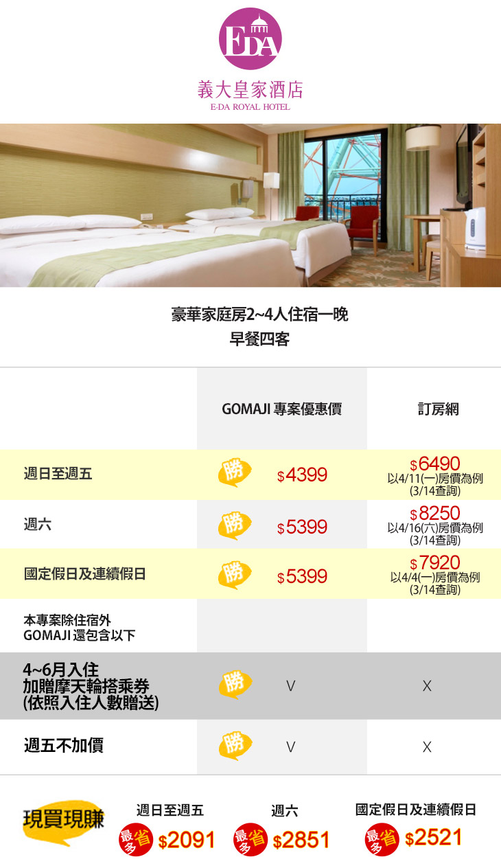 ♛ GOMAJI訂房專享:4-6月入住加贈摩天輪搭乘券(依照入住人數贈送),機會難得,要搶要快!