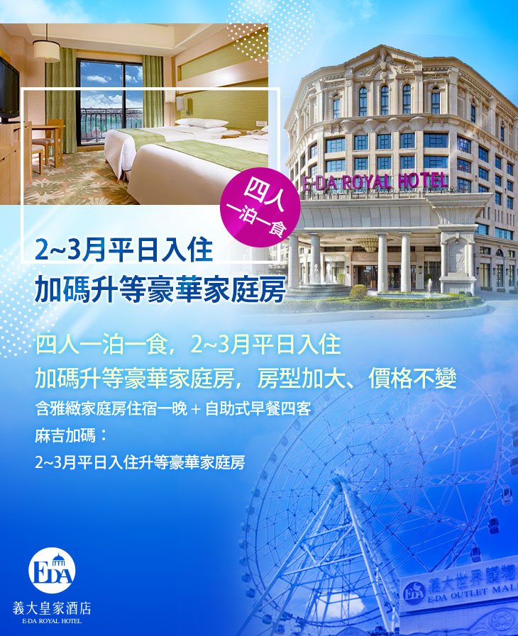 ♛ 平日入住,加碼升等豪華家庭房,房型加大、價格不變!