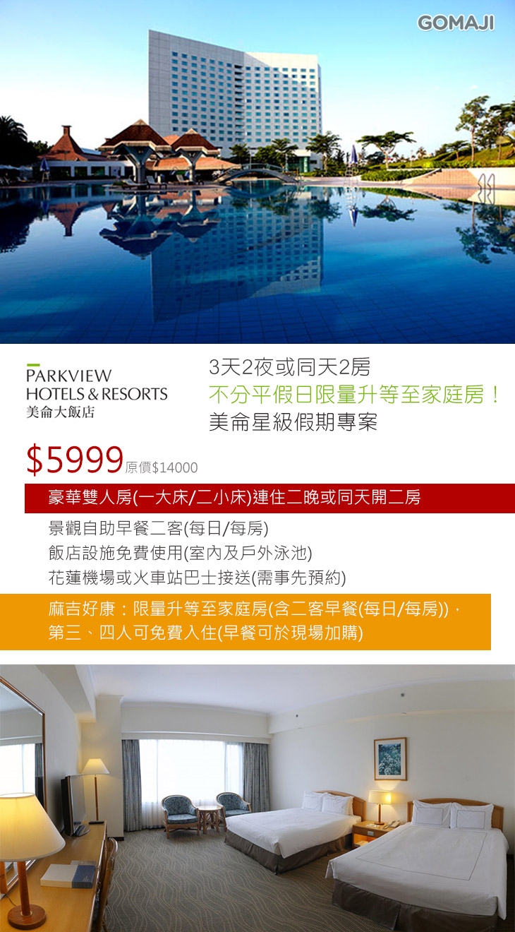 麻吉好康:限量升等至家庭房(含二客早餐(每日/每房)),第三、四人可免費入住(早餐可於現場加購)