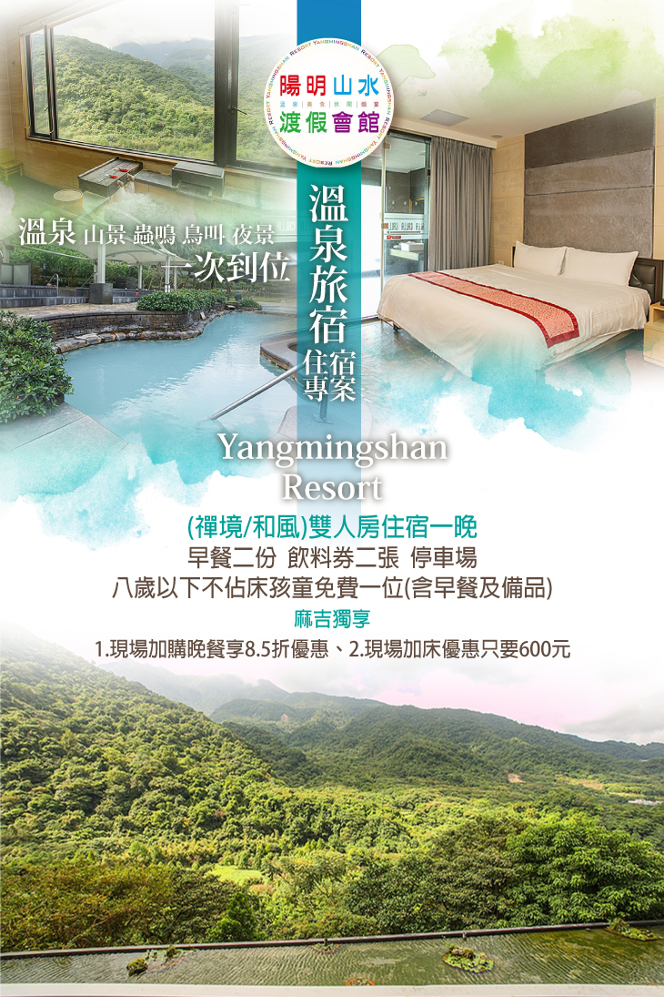 群山環抱的自然環境,享受頂級湯泉!會館內溫泉為白磺泉,又稱為「美人湯」,泉質屬酸性硫酸鹽泉,PH值3.2~4.6,呈淡黃乳白色,有如牛奶狀故又稱「牛奶湯」。在陽明山水間舒放你的身心靈,給你絕佳的感官享受!