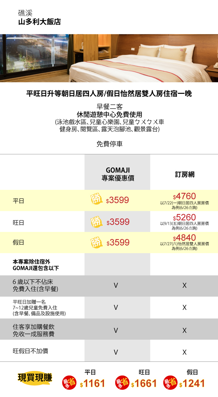 本次與GOMAJI聯合釋出麻吉獨享住宿超值優惠,旺假日不加價!更提供早餐、休閒遊憩中心免費使用及免費停車等麻吉好康,讓您來到【山多利大飯店】,享有高規格、高品質的體驗,賓至如歸!
