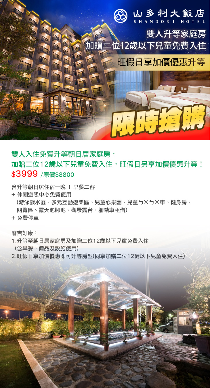 ★ 暑假房開賣!超有誠意雙人升等至朝日居家庭房,另加贈二位12歲以下兒童免費入住(含早餐、備品及設施使用)!旺假日另享加價優惠升等!