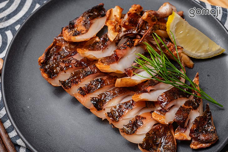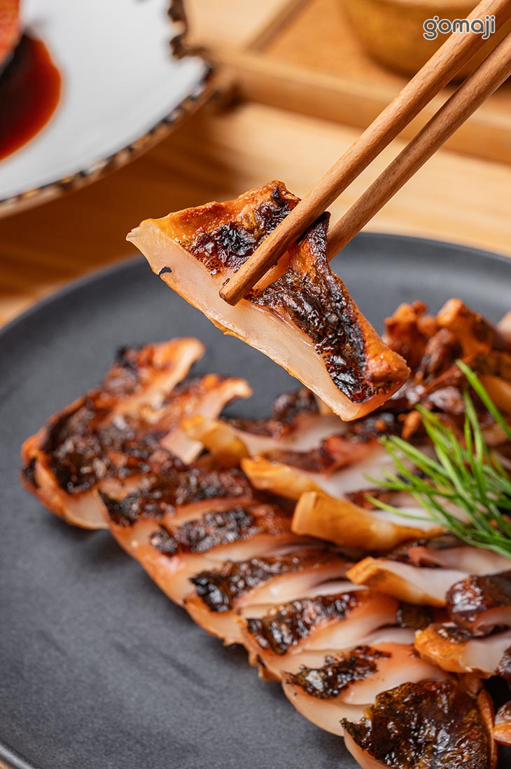 使用新鮮軟絲清洗、醃漬、曬乾,將外皮烤至金黃焦香,視覺上就已令人食指大動。入口的第一感受,是外層炙烤至金黃後的彈韌與微酥,隨著咀嚼逐漸轉為柔軟細嫩,帶出軟絲本身特有的海洋甘甜,搭配些許檸檬提味,便能襯托出其純粹風味。下酒菜中,超人氣NO.1!