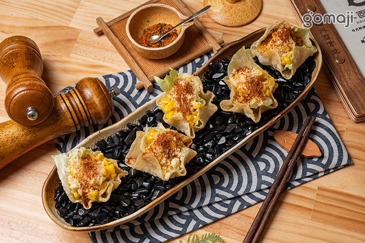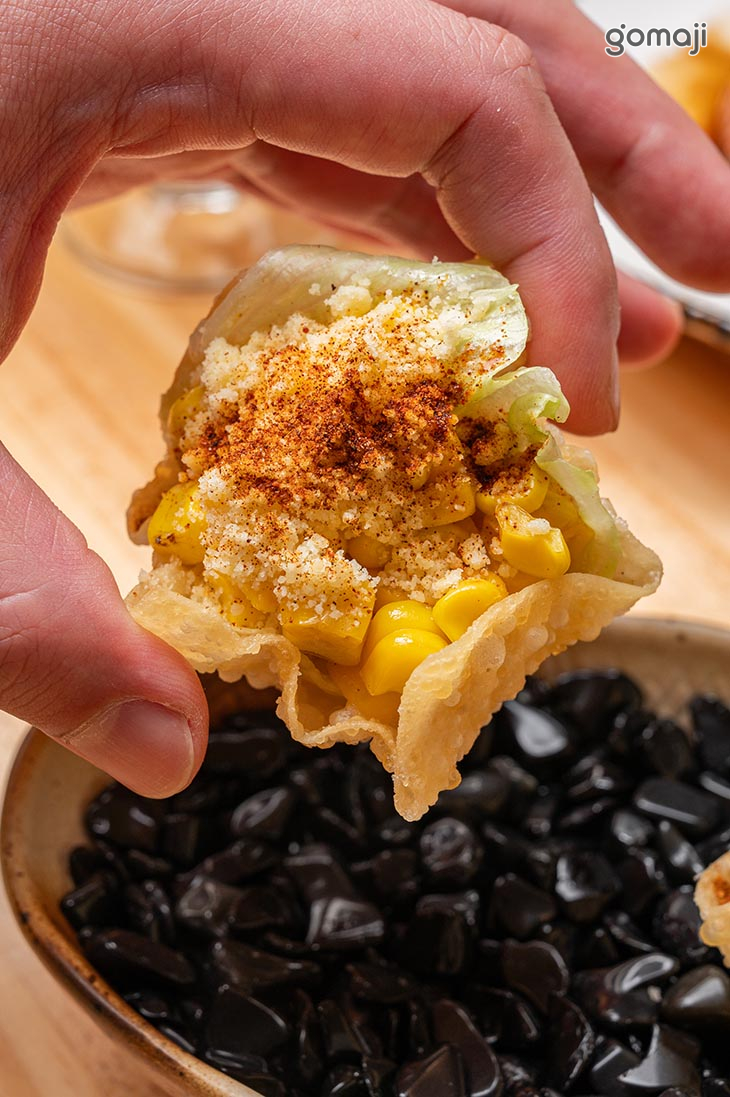 將甜生玉米加入奶油熱炒,放入特製脆殼,再撒上起司粉與墨西哥辣粉,大人小人都喜愛。