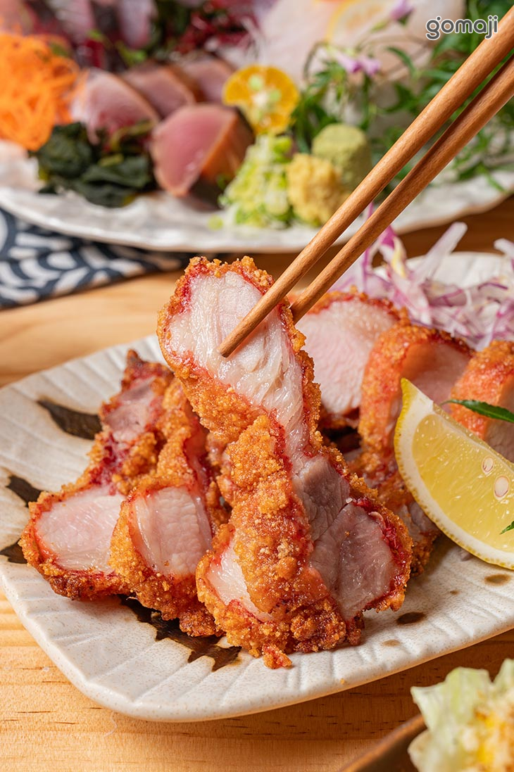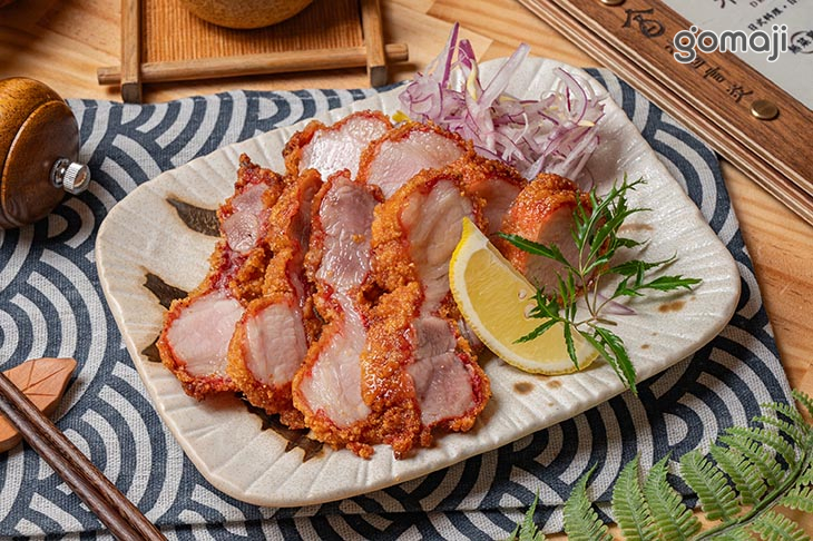 將豚五花的油脂香氣與外酥內嫩的對比發揮到極致。經清酒與紅麴醃製後的豬五花,表層裹上一層薄脆外衣入鍋油炸,高溫瞬間鎖住肉汁,外皮微微起泡、酥脆可口,外層薄脆不厚重。輕咬即碎,隨即釋放出內裡飽滿的肉汁。豚五花在高溫油炸後依然保有柔嫩質地,油脂在口中化開,帶來滑順而濃郁的口感,卻因外層酥香而不顯油膩,尾韻則留下微甜與淡淡鹹香,復刻出古早味紅燒肉大人版本。