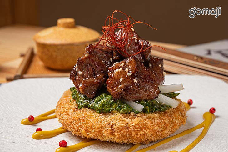 將超綿密的馬鈴薯泥成行酥炸,抹上自製松露青醬,放上奶油醬炒合鴨或牛肋。