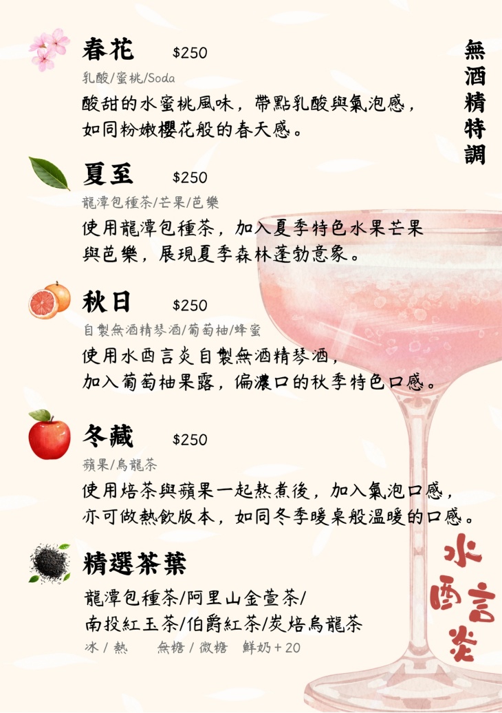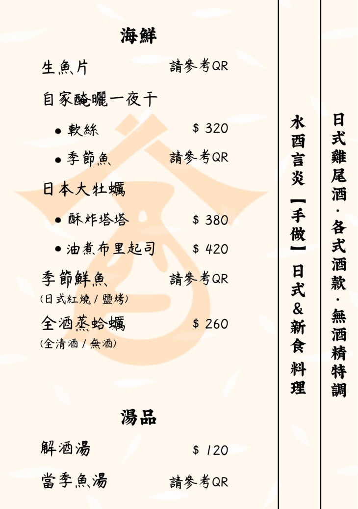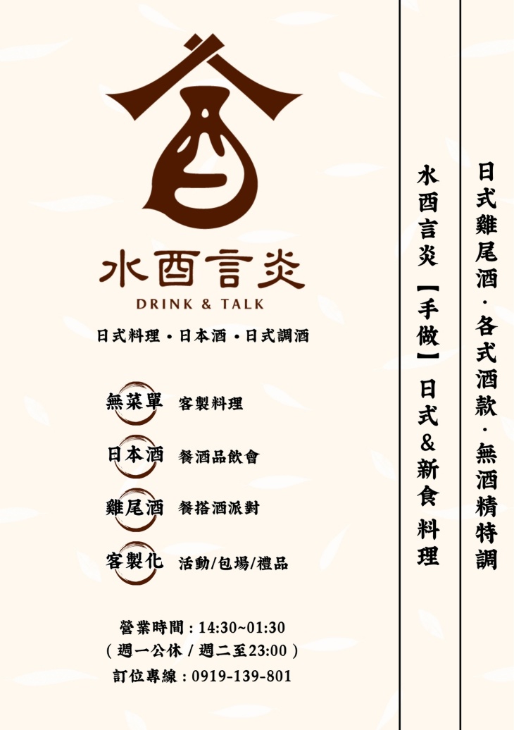 鄰近雙連站與台北車站,步行即可抵達,交通便利。店名由「酒談」拆字而來,帶點趣味與記憶點,也呼應店內輕鬆聊天、小酌交流的核心精神。整體空間以現代日式風格為主,採用大量木質元素鋪陳,搭配溫潤燈光,營造出自然且放鬆的氛圍。吧台與包廂透過跳色設計增添層次,讓不同座位區各有情境。餐點由主廚阿光師操刀,憑藉西餐、拉麵與串燒的多元背景,發展出以日式為基礎並融合變化的料理風格。料理著重食材本味與實驗精神,從炙燒、燒烤到創意小點,皆展現個人特色卻不流於誇張。每日親赴市場挑選新鮮食材與漁獲,並不定期推出限量料理,讓常客每次造訪都能品嚐到不同驚喜。酒單則以日本酒為核心,搭配調酒師將茶與台灣水果融入風味設計,呈現清爽且有層次的飲品選擇。水酉言炎強調「餐」與「酒」的平衡,以及自在不拘束的氛圍。不論是與朋友聚會、微醺放鬆,或單純想找個地方安靜坐著,都能在這裡找到合適的節奏。.jpg)