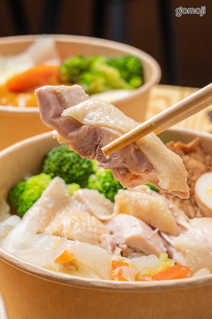嫩白的去骨雞腿肉、翠綠飽滿的花椰菜、金黃色的滷蛋,加上爽脆的高麗菜,色彩層次豐富又自然。雞腿肉是這碗料理的靈魂,肉質細嫩,搭配旁邊可選的蔥香與辣椒醬料,更能將肉香提升到另一個層次,清香、微辣、鹹香交織,讓每一口都充滿驚喜。花椰菜翠綠脆口,保留水分與清甜,高麗菜炒得柔軟卻不油膩,與雞肉形成完美的口感對比。
