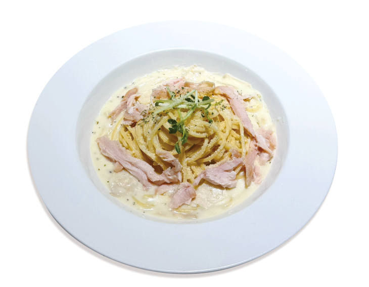 以鮮奶油慢火調製出醇厚白醬,濃郁乳香完美附著於Q彈麵條,每一口都能感受奶香與小麥風味交織的飽滿層次。大方鋪上的煙燻雞肉片肉質細嫩,獨特的微燻氣息與溫潤醬汁相得益彰,在精緻擺盤下宛如一場味蕾盛宴。這份份量紮實且溫潤入心的料理,不僅展現了對細節的講究,更是深受大人小孩喜愛的舒心首選。
