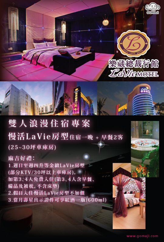 1.週日至週四升等金緻LaVie房型(部分KTV/30坪以上車庫房),加第3、4人免費入住(第3、4人含早餐、備品及被枕,不含床墊)
