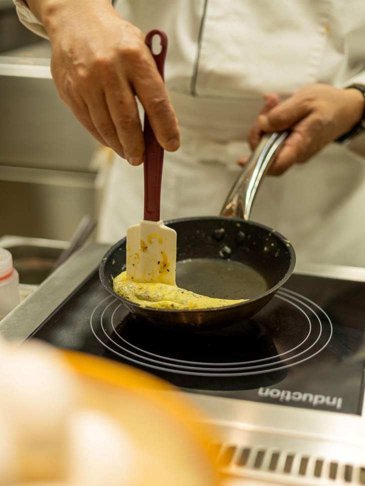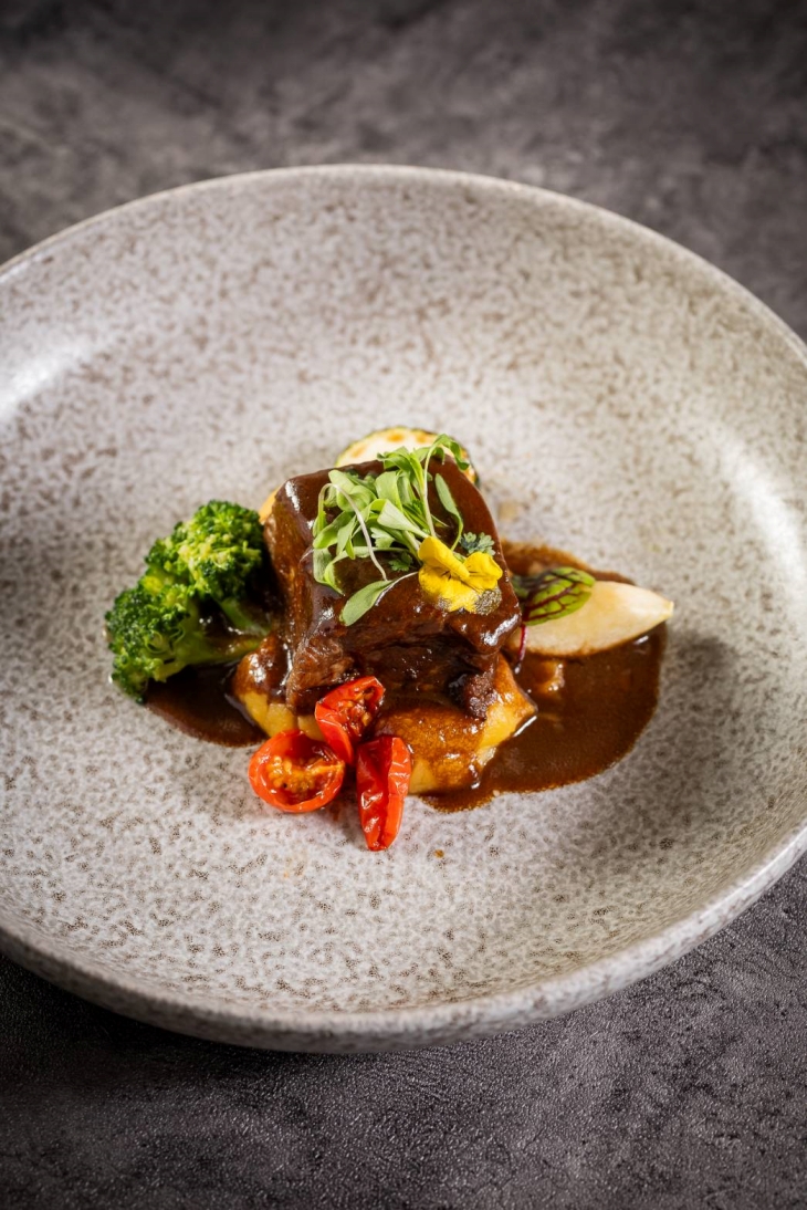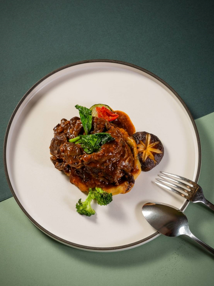 融合中式東坡慢燉技法與法式紅酒醬汁的創意料理。以文火長時間細緻燉煮,使和牛油脂與膠質充分釋放,肉質入口即化、細緻滑順。搭配經典紅酒醬汁,增添深層果香與醇厚尾韻,讓整體風味更顯立體且優雅。是一道兼具東方溫潤與西式層次的精緻主菜。