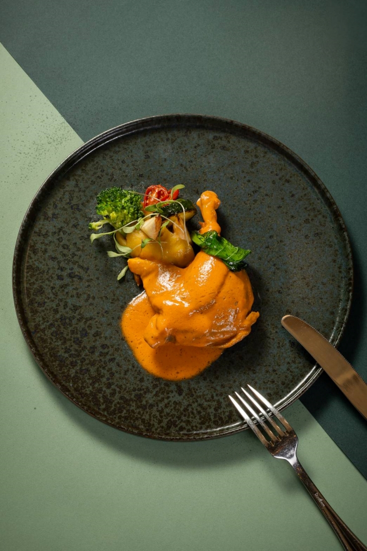 源自法國西南部的經典料理,融合傳統油封技法與現代風味演繹。鴨腿經細火慢燉至柔嫩入味,表層覆以主廚特製番茄醬汁,色澤飽滿誘人。入口先感受到番茄的微酸果香,隨後帶出鴨肉濃郁的肉香與油脂的自然甘甜。醬汁層次分明,從清新果香到溫潤厚實,讓整體風味更顯圓潤深邃。佐以當季時蔬,增添清新與口感變化,使這道料理在法式優雅之中,也保有家常燉煮的溫暖韻味,越品越令人著迷。