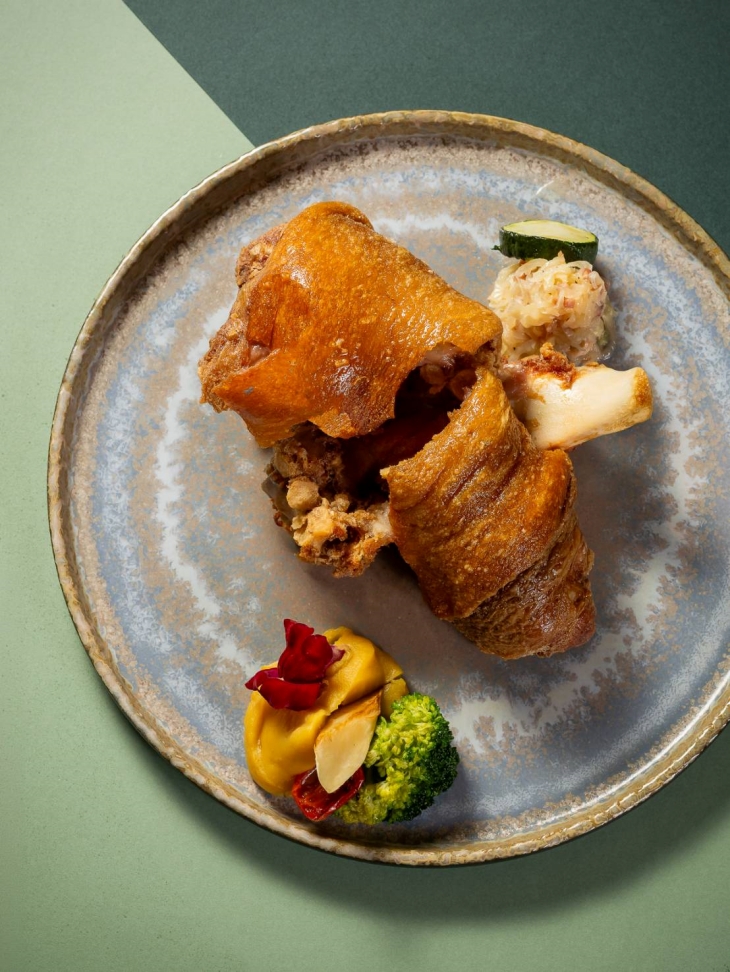 經典德式風味代表作,選用豬脛肉經醃製後細火烹調,再以高溫烘烤至外皮金黃酥脆。外層酥香、內裡軟嫩多汁,膠質豐富且油脂香氣飽滿。搭配自製德國酸菜,帶出清爽酸香,有效平衡肉質的厚實口感,再佐以黃芥末醬點綴,層次更加分明。是一道豪邁中帶有細緻風味的經典料理。