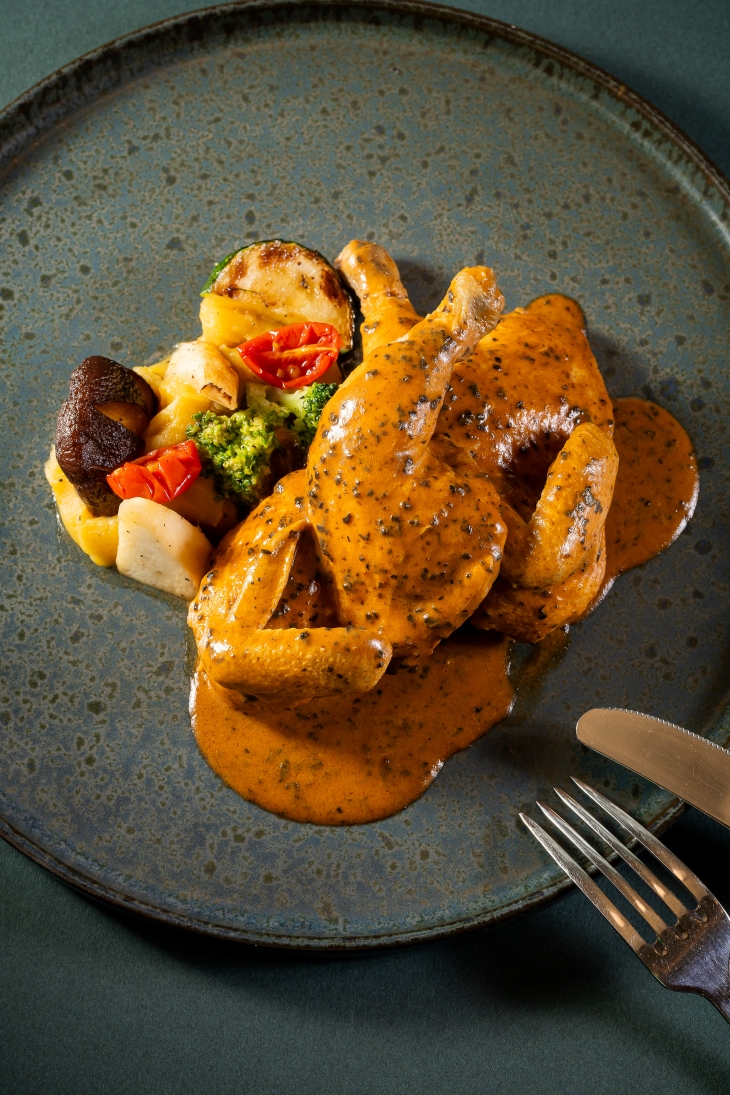 黑松露奶油燉春雞甫一上桌,濃郁而優雅的香氣隨即瀰漫,瞬間喚醒味蕾。整隻春雞以低溫長時間燉煮,鎖住肉質的鮮嫩與多汁,外層包覆滑順厚實的黑松露奶油醬,並以羊肚菌提鮮,層層堆疊出深邃迷人的蕈菇香氣。入口先是溫潤醇厚的奶香,隨後松露特有的細緻尾韻緩緩展開,優雅而綿長。雞肉纖維柔軟細緻,輕輕切開即可感受飽滿肉汁,口感溫潤不柴。搭配時蔬與配菜,於濃郁之中取得恰到好處的清爽平衡,是一道兼具份量與精緻度的經典主餐。